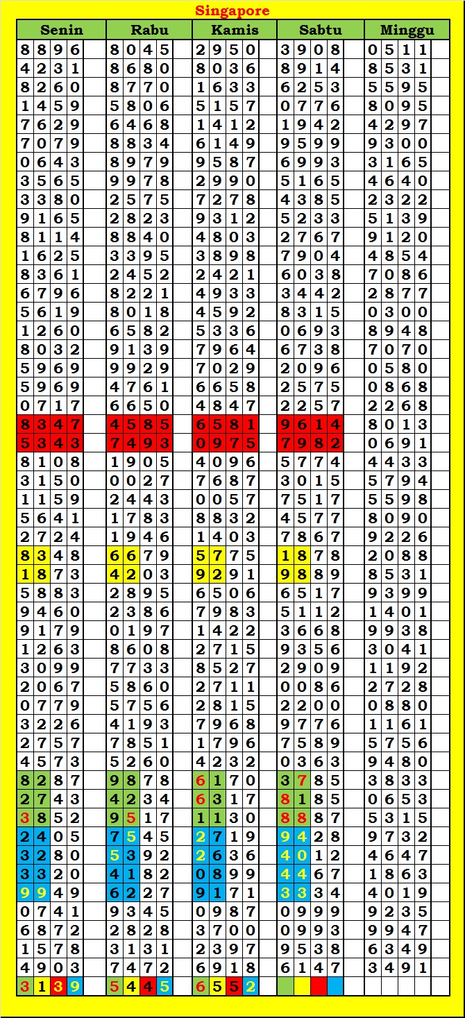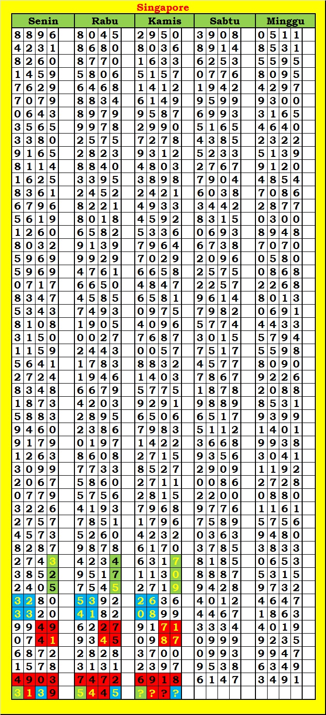 MASTER SINGAPURA Sabtu, 04-10-2025 Merupakan Prediksi Otomatis yang menggabungkan Metode Kalender Togel Dengan Rumus-rumus kontrol yang sudah terbukti keakuratanya.Gunakan Aplikasi Rekap untuk mendapatkan LN TOP. Harap Maklum Jika kadang meleset MASTER SINGAPURA kita. Jadikan ini sebagai perbandingan saja dan tetap UPS