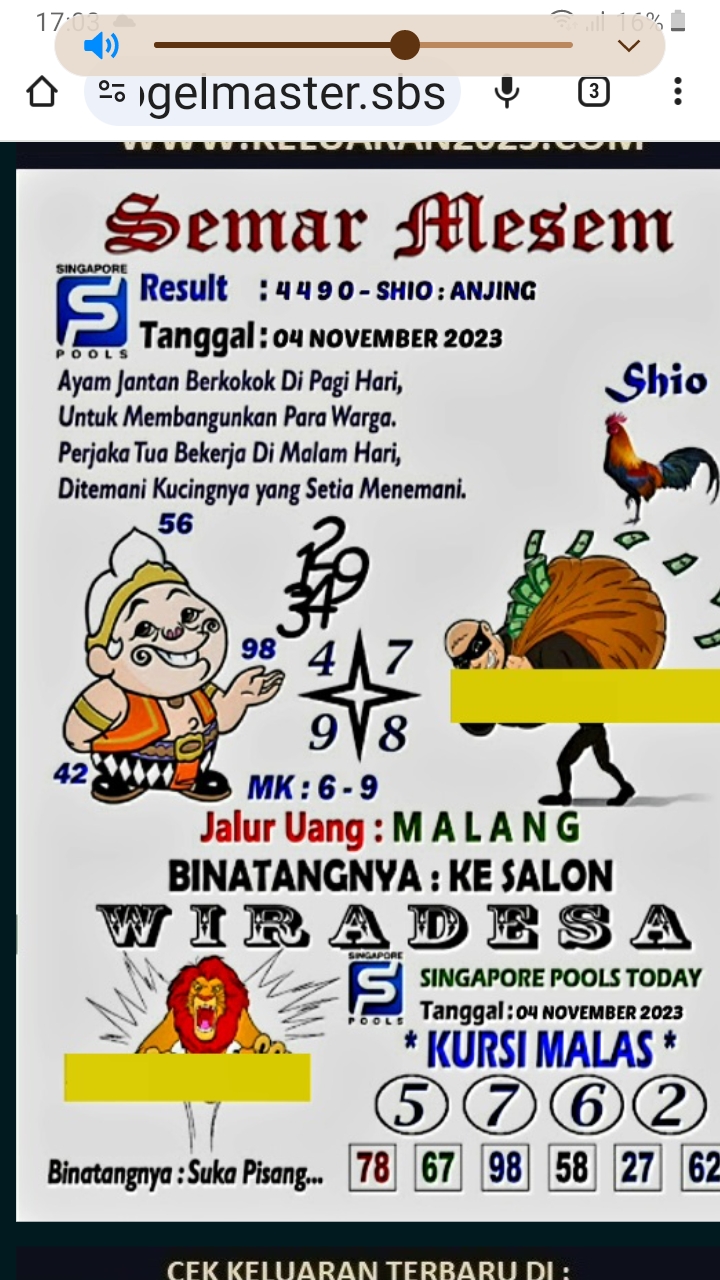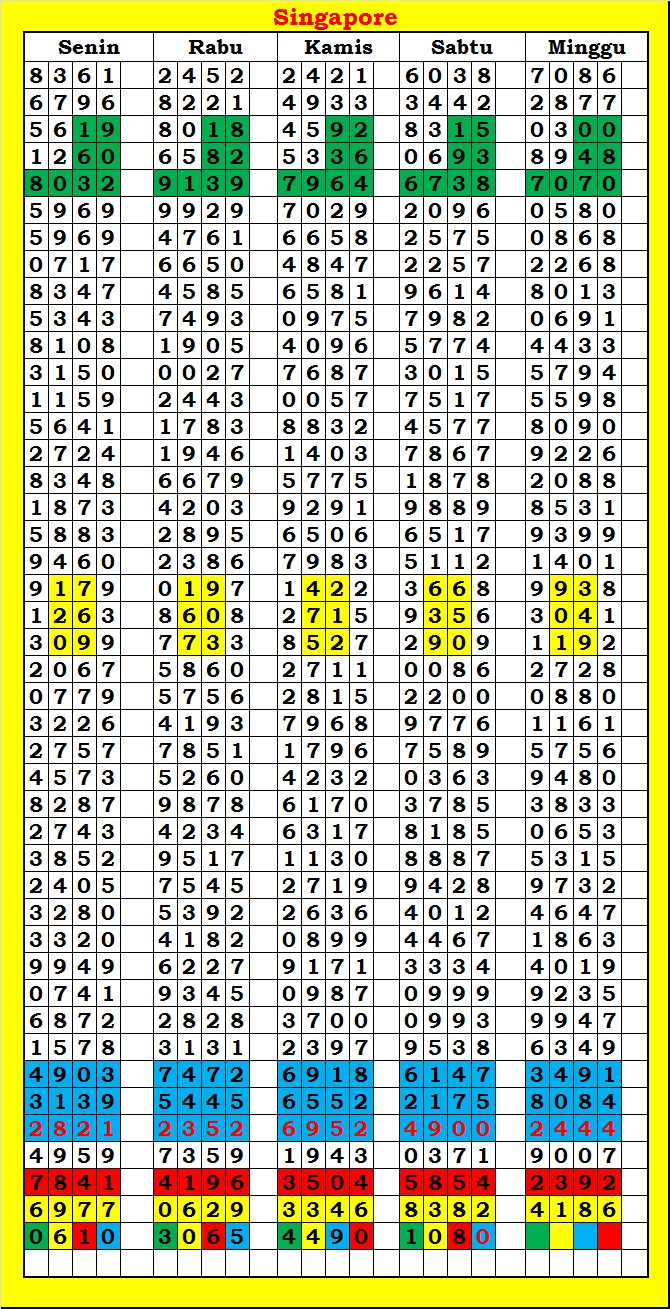 MASTER SINGAPURA Sabtu, 04-10-2025 Merupakan Prediksi Otomatis yang menggabungkan Metode Kalender Togel Dengan Rumus-rumus kontrol yang sudah terbukti keakuratanya.Gunakan Aplikasi Rekap untuk mendapatkan LN TOP. Harap Maklum Jika kadang meleset MASTER SINGAPURA kita. Jadikan ini sebagai perbandingan saja dan tetap UPS