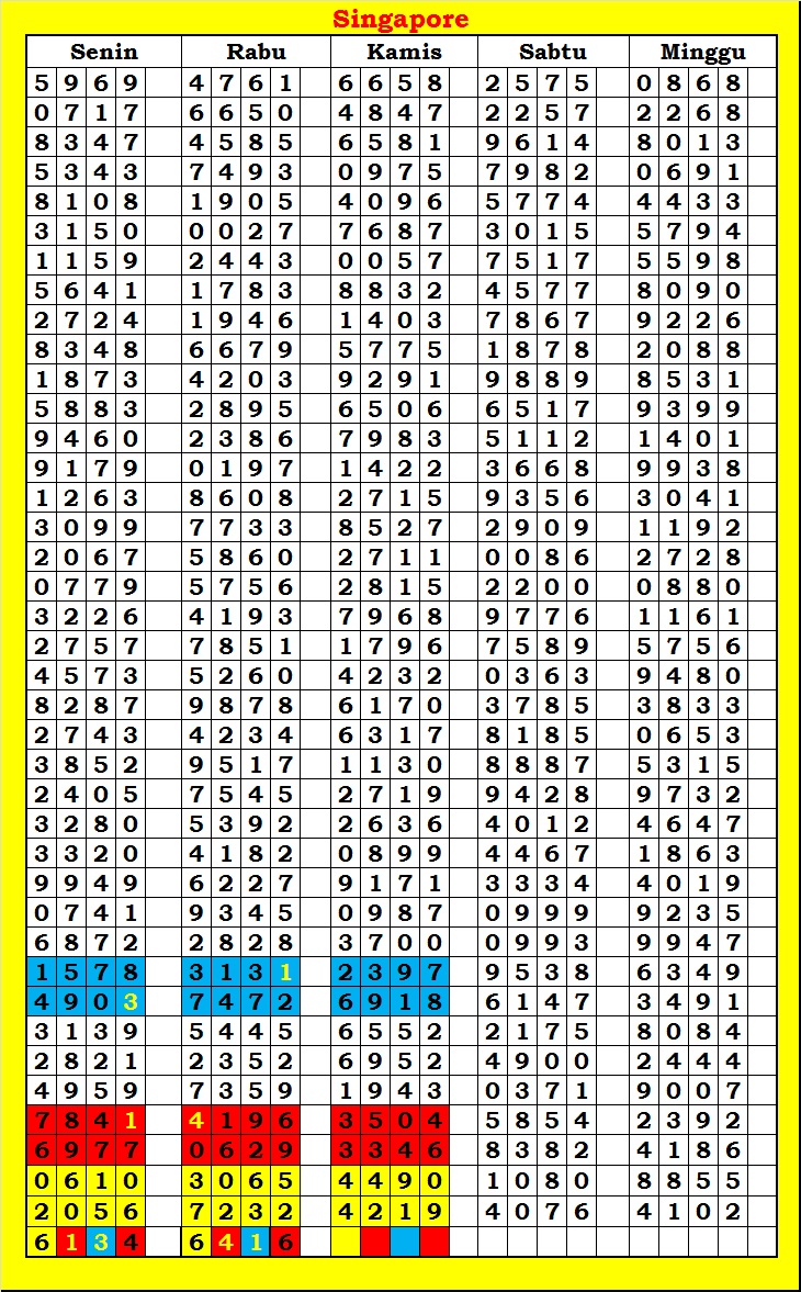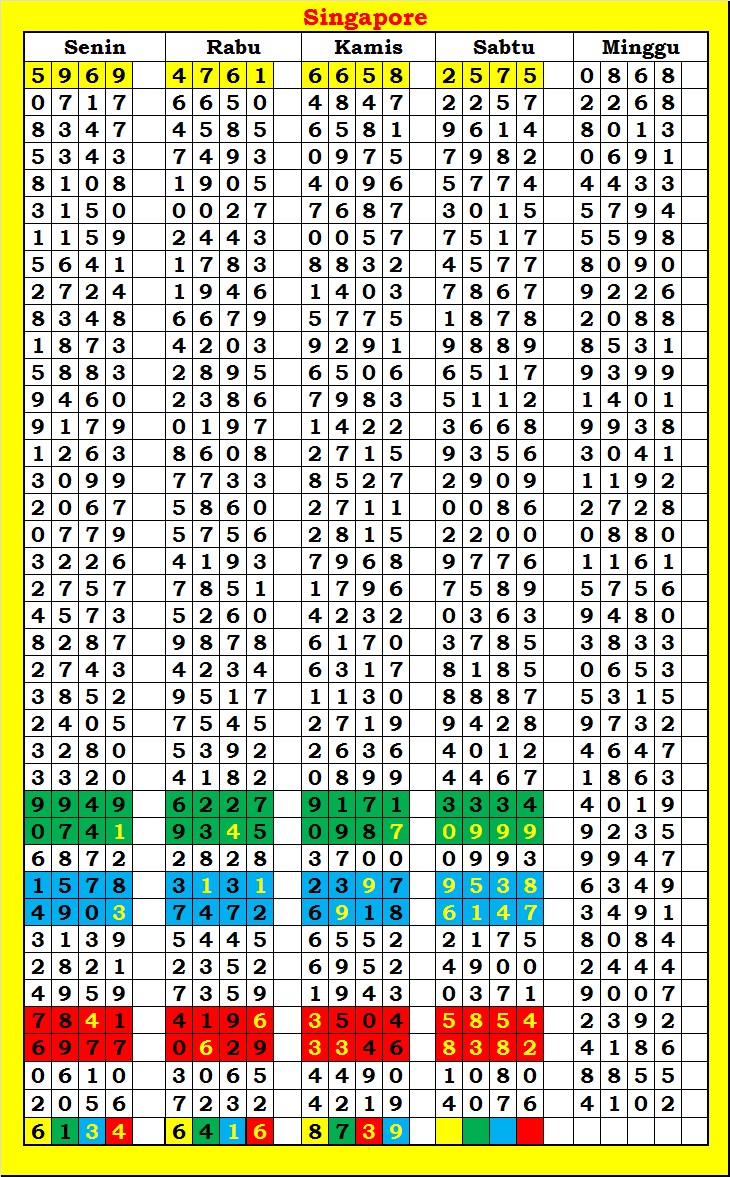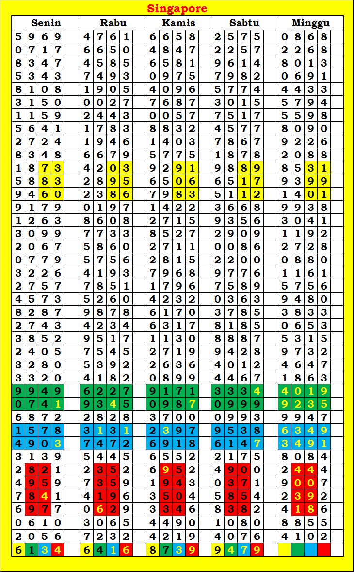 MASTER SINGAPURA Sabtu, 04-10-2025 Merupakan Prediksi Otomatis yang menggabungkan Metode Kalender Togel Dengan Rumus-rumus kontrol yang sudah terbukti keakuratanya.Gunakan Aplikasi Rekap untuk mendapatkan LN TOP. Harap Maklum Jika kadang meleset MASTER SINGAPURA kita. Jadikan ini sebagai perbandingan saja dan tetap UPS