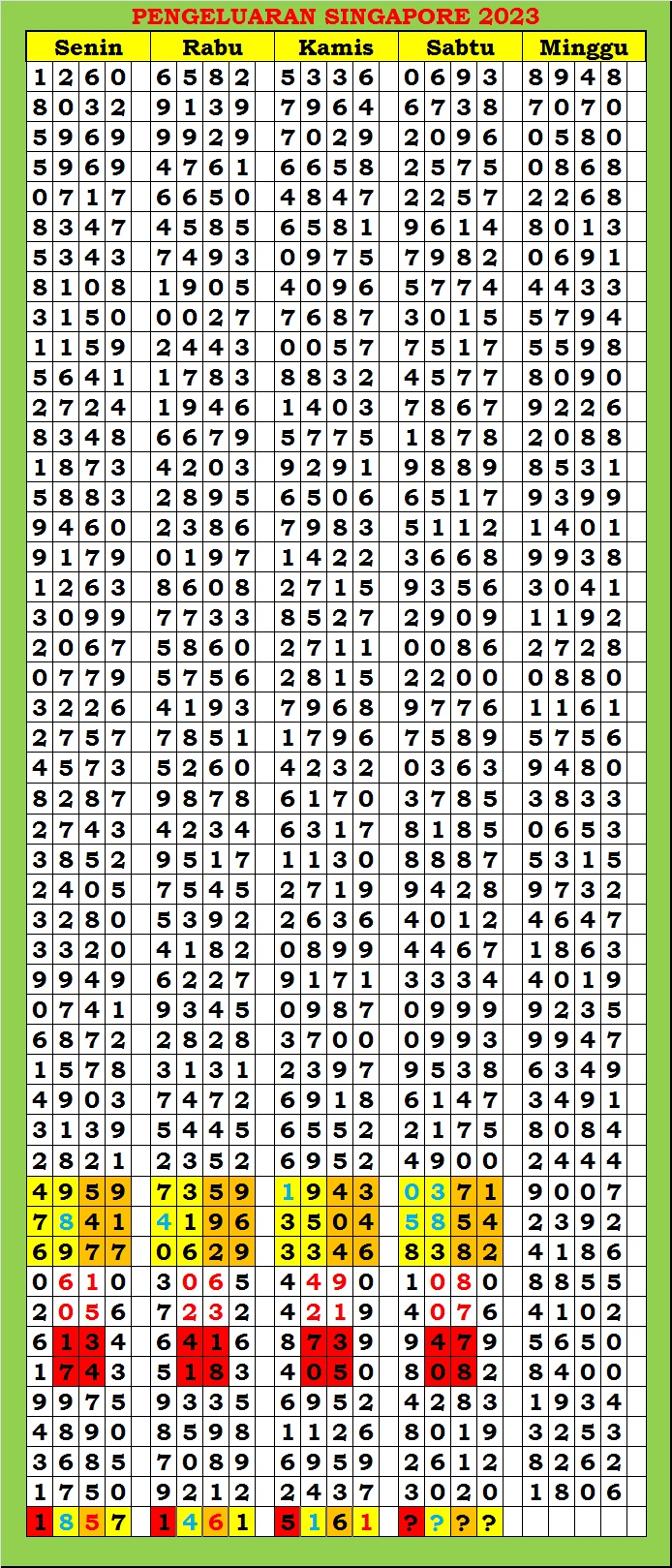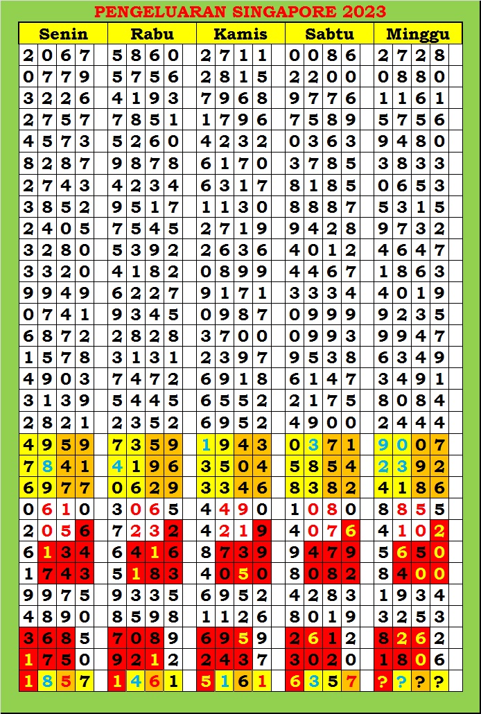 MASTER SINGAPURA Sabtu, 04-10-2025 Merupakan Prediksi Otomatis yang menggabungkan Metode Kalender Togel Dengan Rumus-rumus kontrol yang sudah terbukti keakuratanya.Gunakan Aplikasi Rekap untuk mendapatkan LN TOP. Harap Maklum Jika kadang meleset MASTER SINGAPURA kita. Jadikan ini sebagai perbandingan saja dan tetap UPS