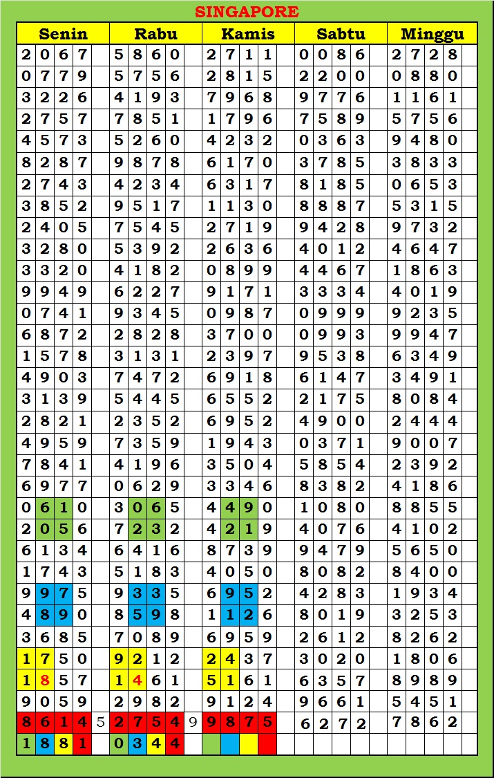 MASTER SINGAPURA Sabtu, 04-10-2025 Merupakan Prediksi Otomatis yang menggabungkan Metode Kalender Togel Dengan Rumus-rumus kontrol yang sudah terbukti keakuratanya.Gunakan Aplikasi Rekap untuk mendapatkan LN TOP. Harap Maklum Jika kadang meleset MASTER SINGAPURA kita. Jadikan ini sebagai perbandingan saja dan tetap UPS