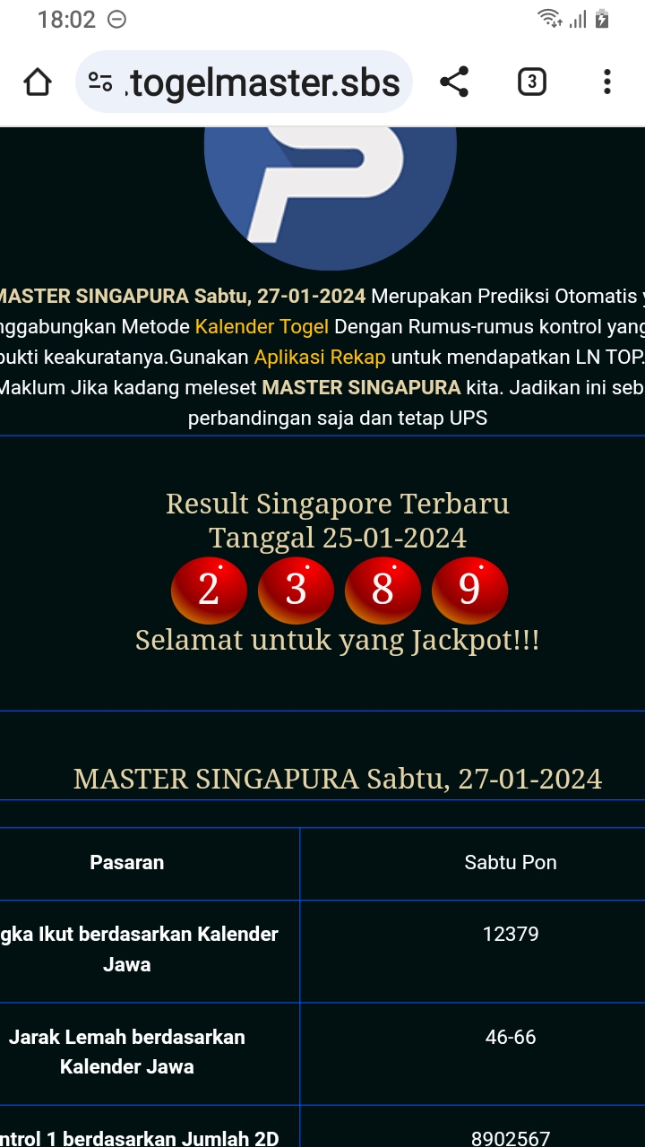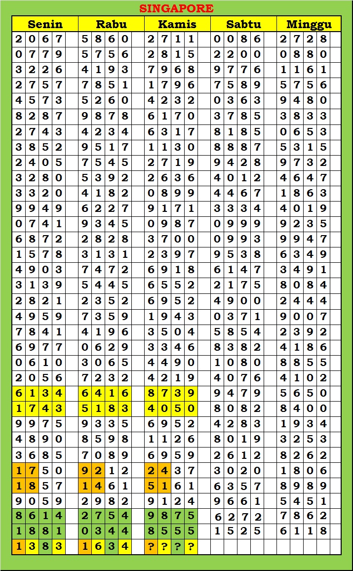 MASTER SINGAPURA Sabtu, 04-10-2025 Merupakan Prediksi Otomatis yang menggabungkan Metode Kalender Togel Dengan Rumus-rumus kontrol yang sudah terbukti keakuratanya.Gunakan Aplikasi Rekap untuk mendapatkan LN TOP. Harap Maklum Jika kadang meleset MASTER SINGAPURA kita. Jadikan ini sebagai perbandingan saja dan tetap UPS