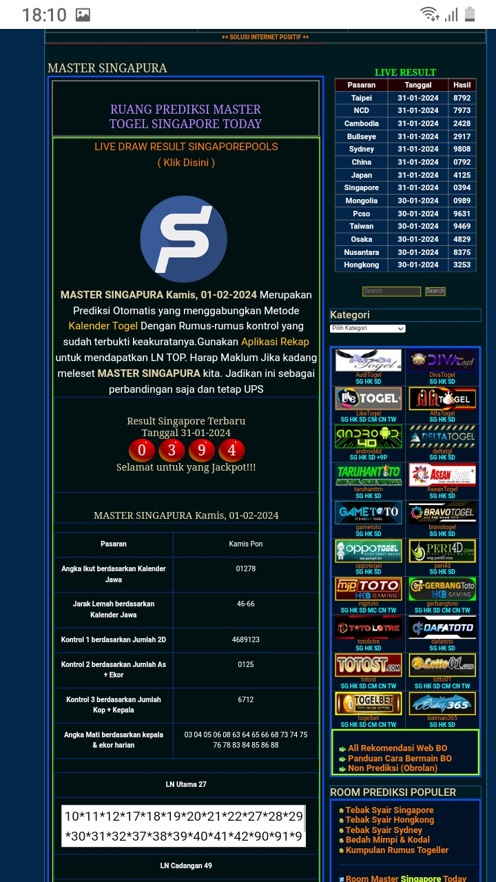 MASTER SINGAPURA Sabtu, 04-10-2025 Merupakan Prediksi Otomatis yang menggabungkan Metode Kalender Togel Dengan Rumus-rumus kontrol yang sudah terbukti keakuratanya.Gunakan Aplikasi Rekap untuk mendapatkan LN TOP. Harap Maklum Jika kadang meleset MASTER SINGAPURA kita. Jadikan ini sebagai perbandingan saja dan tetap UPS