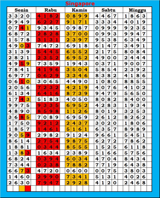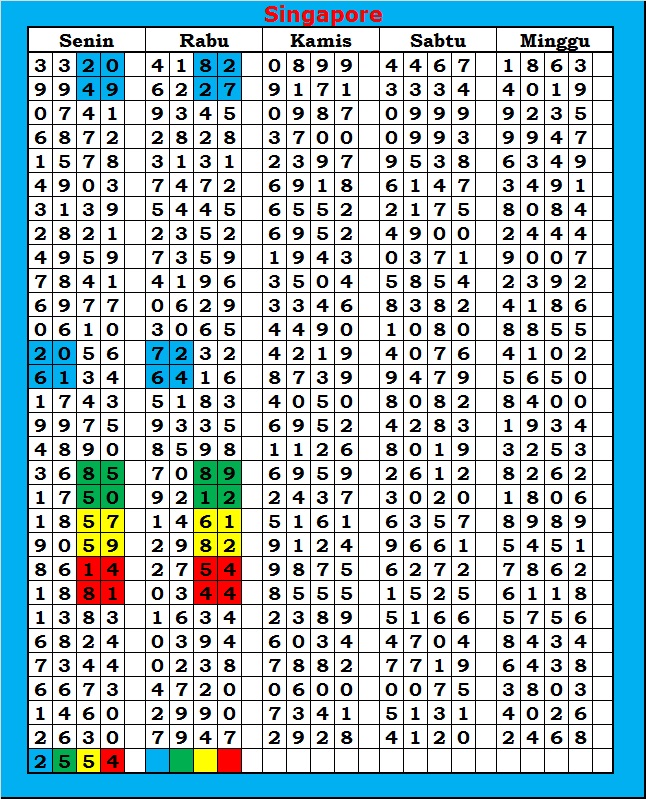 MASTER SINGAPURA Sabtu, 04-10-2025 Merupakan Prediksi Otomatis yang menggabungkan Metode Kalender Togel Dengan Rumus-rumus kontrol yang sudah terbukti keakuratanya.Gunakan Aplikasi Rekap untuk mendapatkan LN TOP. Harap Maklum Jika kadang meleset MASTER SINGAPURA kita. Jadikan ini sebagai perbandingan saja dan tetap UPS