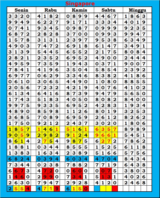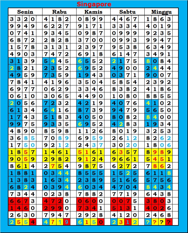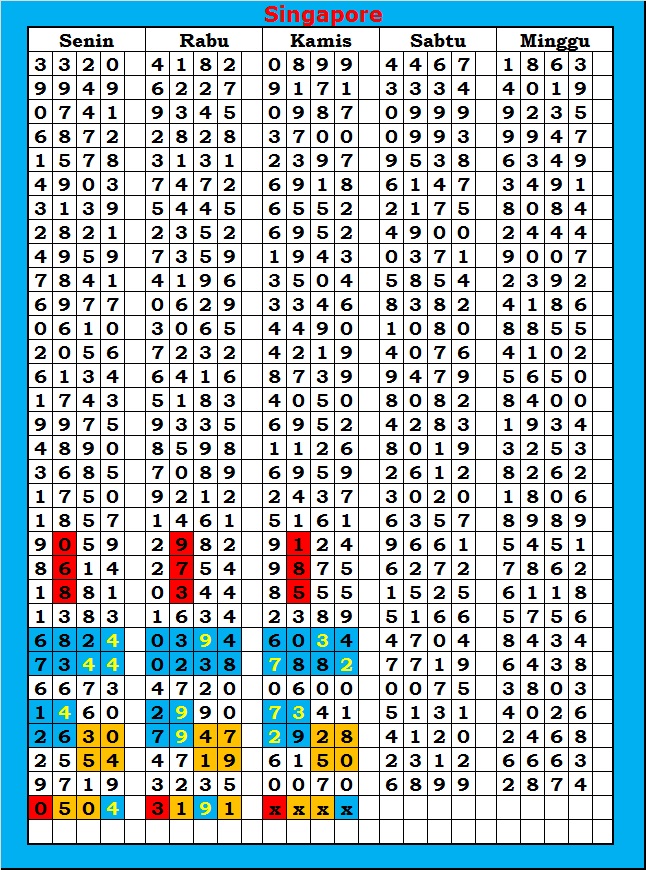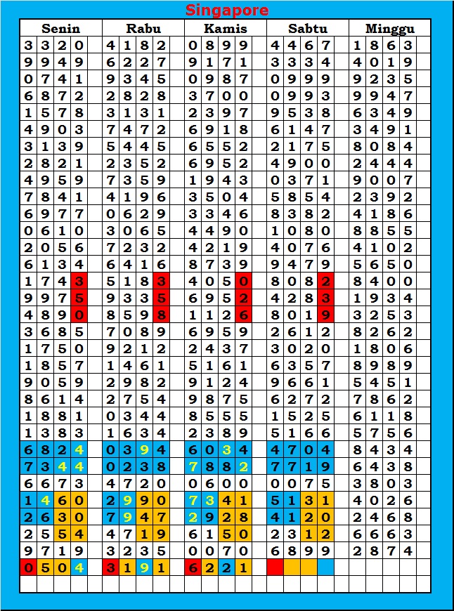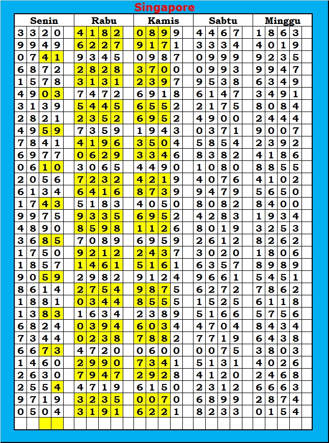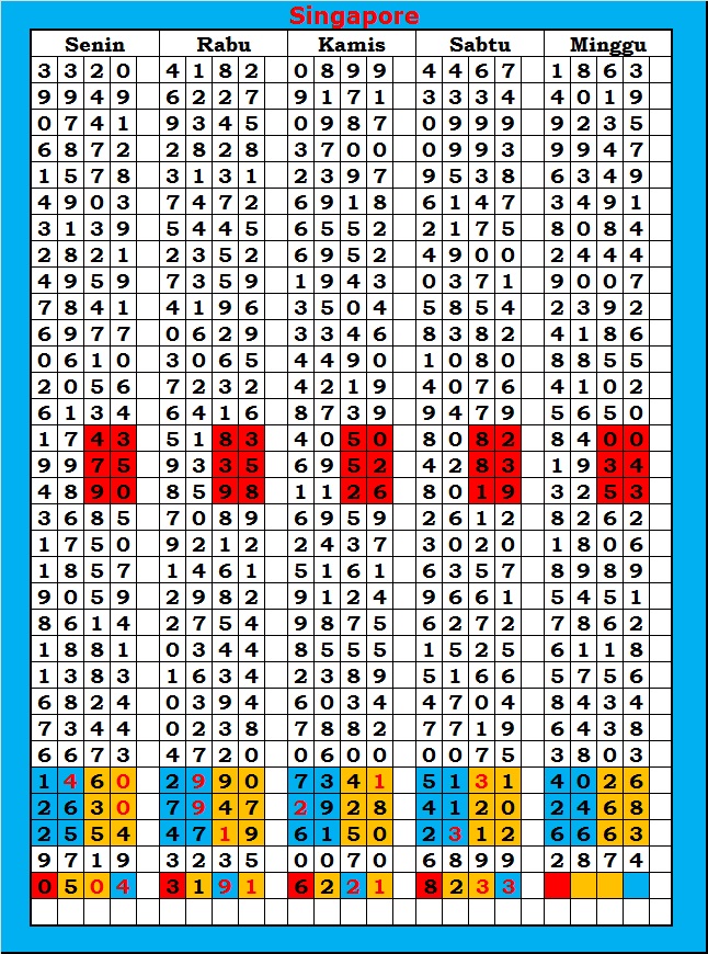 MASTER SINGAPURA Sabtu, 04-10-2025 Merupakan Prediksi Otomatis yang menggabungkan Metode Kalender Togel Dengan Rumus-rumus kontrol yang sudah terbukti keakuratanya.Gunakan Aplikasi Rekap untuk mendapatkan LN TOP. Harap Maklum Jika kadang meleset MASTER SINGAPURA kita. Jadikan ini sebagai perbandingan saja dan tetap UPS