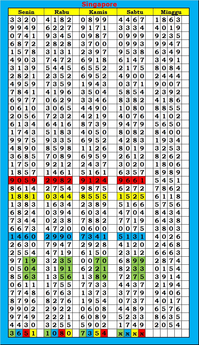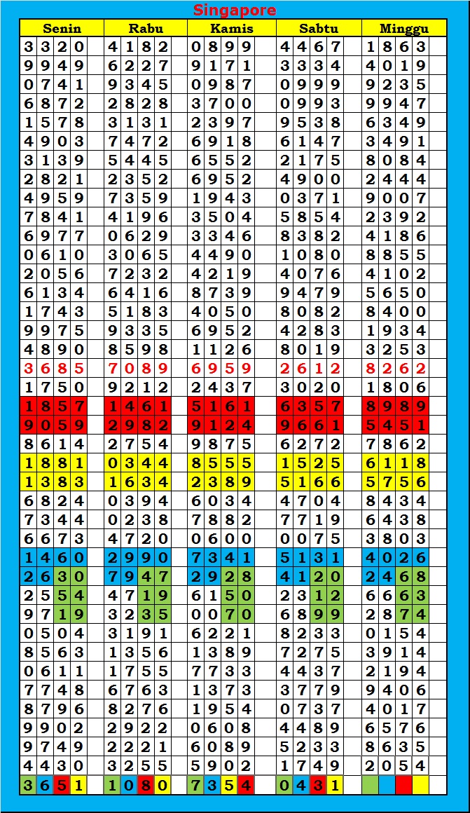 MASTER SINGAPURA Sabtu, 04-10-2025 Merupakan Prediksi Otomatis yang menggabungkan Metode Kalender Togel Dengan Rumus-rumus kontrol yang sudah terbukti keakuratanya.Gunakan Aplikasi Rekap untuk mendapatkan LN TOP. Harap Maklum Jika kadang meleset MASTER SINGAPURA kita. Jadikan ini sebagai perbandingan saja dan tetap UPS