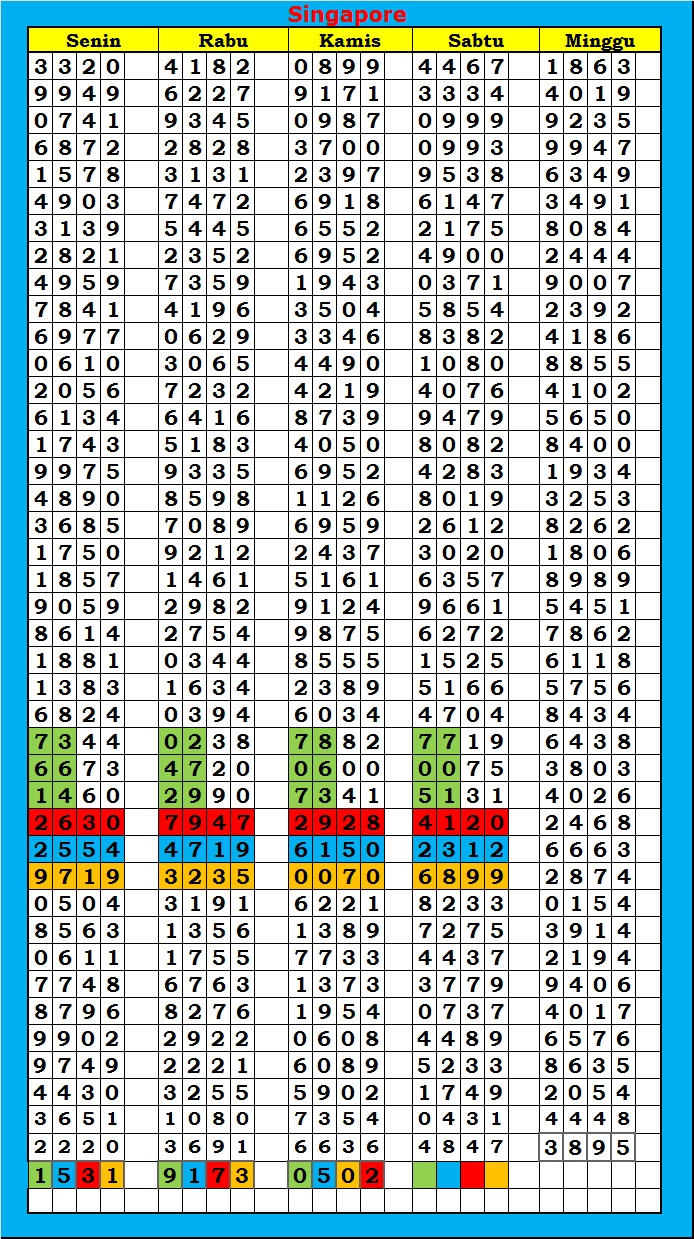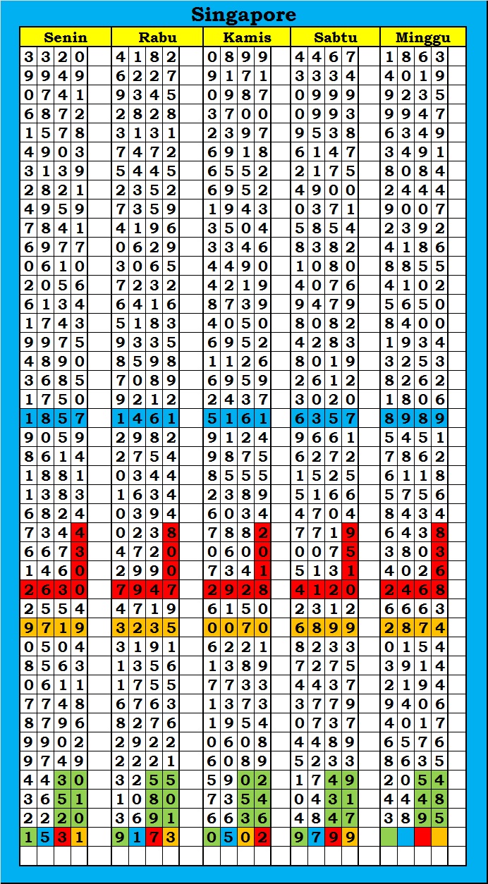MASTER SINGAPURA Sabtu, 04-10-2025 Merupakan Prediksi Otomatis yang menggabungkan Metode Kalender Togel Dengan Rumus-rumus kontrol yang sudah terbukti keakuratanya.Gunakan Aplikasi Rekap untuk mendapatkan LN TOP. Harap Maklum Jika kadang meleset MASTER SINGAPURA kita. Jadikan ini sebagai perbandingan saja dan tetap UPS