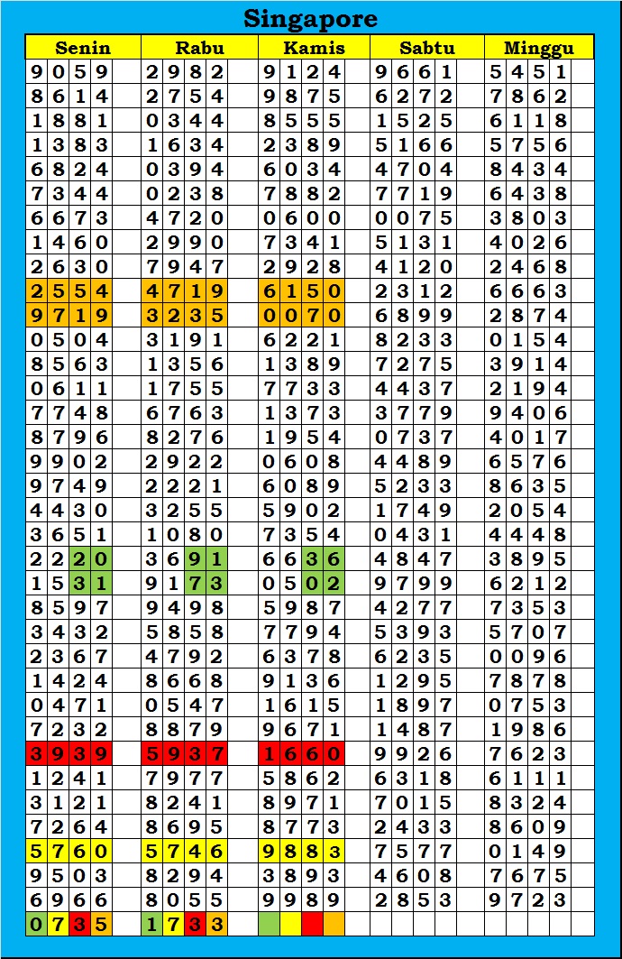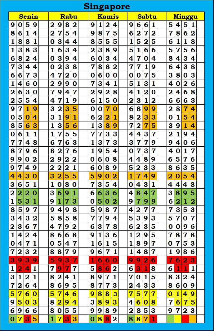 MASTER SINGAPURA Sabtu, 04-10-2025 Merupakan Prediksi Otomatis yang menggabungkan Metode Kalender Togel Dengan Rumus-rumus kontrol yang sudah terbukti keakuratanya.Gunakan Aplikasi Rekap untuk mendapatkan LN TOP. Harap Maklum Jika kadang meleset MASTER SINGAPURA kita. Jadikan ini sebagai perbandingan saja dan tetap UPS